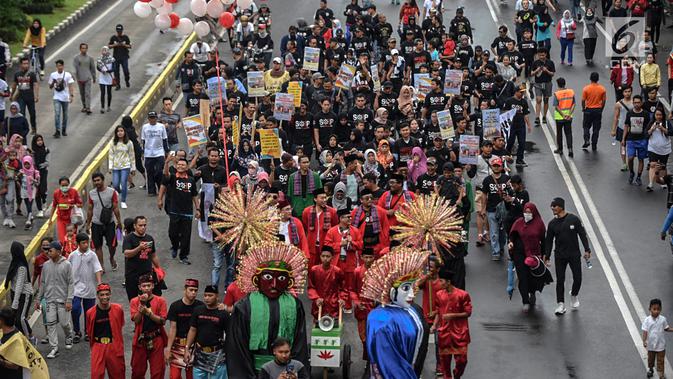 Massa Serikat Pekerja Container (SPC) menggelar karnaval pelabuhan di area car free day, Jalan Thamrin, Jakarta, Minggu (17/2). Aksi tersebut tekait penolakan liberalisasi pengelolaan Pelabuhan Tanjung Priok oleh vendor asing. (Liputan6.com/HO/Mico)