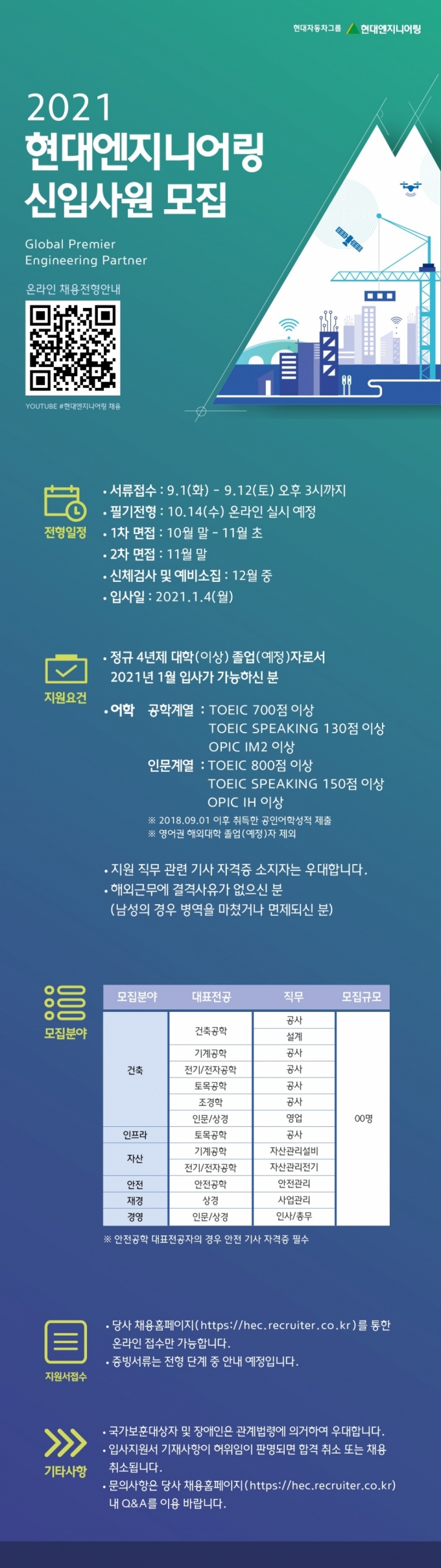 현대엔지니어링은 △건축 △인프라 △자산관리 △안전 △재경 △경영 등 6개 분야에서 신입사원 공개채용을 진행한다고 2일 밝혔다. 지원 요건은 정규 4년제 대학(이상) 졸업(예정)자로 어학점수 요건을 충족하는 경우다.