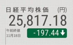 18日午前の東京株式市場で日経平均株価は反落し、前日比197円44銭(0.76%)安の2万5817円18銭で終えた。最近の相場上昇ペースが速かったため、高値警戒感が強まり利益確定売りが優勢だった。景気敏感株を中心に幅広い銘柄が売られ、下げ幅は300円に迫る場面もあった。