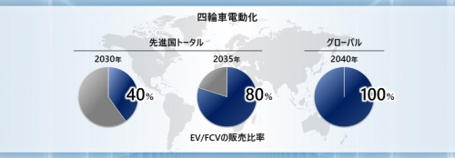 「2040年に脱エンジンを実現する」という目標の根拠もシンプルだ。クルマが10年程度使われる商品であることを考えれば、2050年に全ての製品のカーボンニュートラルを実現するためには、2040年ごろには脱エンジンを実現することが必要だろう、というものである。この目標を実現するために、「先進国全体でのEV、FCVの販売比率を2030年に40%、2035年には80%」を目指す。