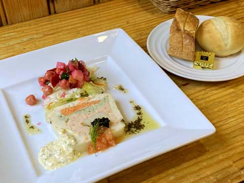 最初に出てきたパンと前菜は、鮭のテリーヌ。野菜にビーツとひよこ豆のトッピングで爽やかかつ品の好いアクセントが効かせてあり、テリーヌにも3種のソースとキャビアが添えられている。これが普通に美味い。いや何が言いたいかというと、こういうテリーヌは1200円のセットなんかで出てきやしない。もっと本格的な値段のコースの前菜と考えても美味いといえる本物である。