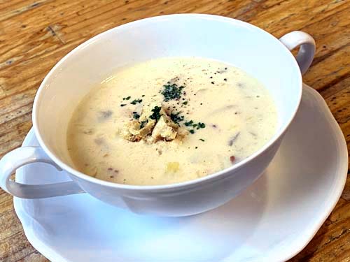 次いでスープだ。濃厚なクリーム仕立てで、きのこと野菜がたっぷり入っている。そういう意味ではちょっとシチュー的である。この時点で気付いたのは、この店には「コースらしく体裁を整えておけばいいだろう」的発想がまったくない。単価だけ考えたら適当なコンソメに映える浮き実を散らして出しておけば、1200円のお代に誰も文句を付けないし、世の中の多数派はそうしている。