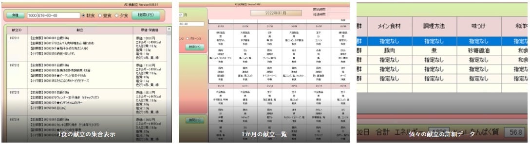 ・栄養価や原価はもちろん、1食の彩りの良さを出すためのものや、味付け、調理方法、和洋中、使用する食材などについて頻度や使用間隔を設定するなど、日々の食事のバリエーションを出すためのものも可能で、1日3食を対象とした献立でも飽きがこないようになっています。