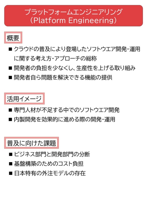 ただし、プラットフォームエンジニアリングという言葉が特定の開発手法や技術を指すものではないため、それが何かと問われたときの説明が抽象的で、その背景を理解していないと分かりにくい。例えばガートナーではプラットフォームエンジニアリングを「ソフトウエアのデリバリーとライフサイクル管理を目的としたセルフサービス型の企業内開発者プラットフォームの構築と運用に関する取り組み」と説明している。