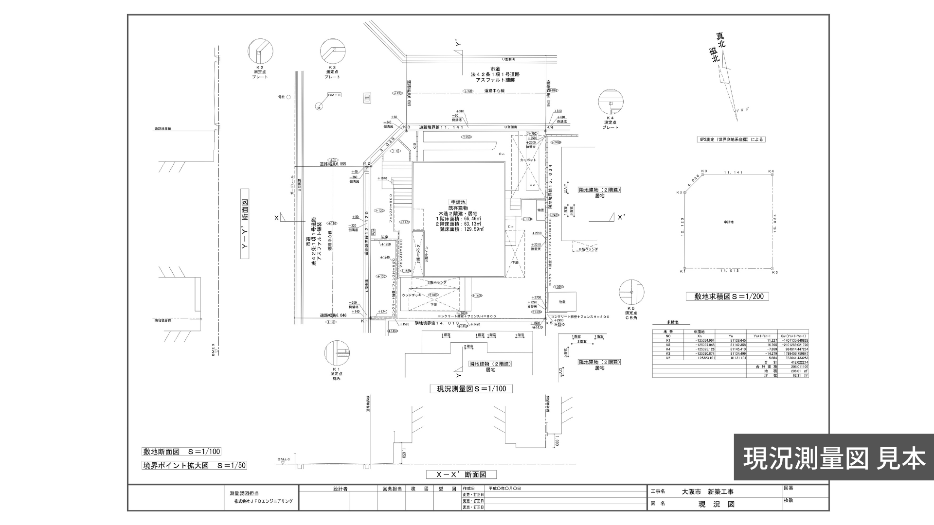 家などを建築する際に土地の広さ・高さなどを測量、敷地の調査をし、現況測量図と呼ばれる図面を作成することを現況測量と言います。土地の位置や大きさだけではなく、境界標や隣地との間にあるフェンス、土地に接する道路など土地の状況を把握できる図面が現況測量図です。この現況測量図を基にして建物が計画されるため、建築前には必ずこの現況測量が必要になります。